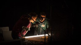 Pénombre documente indirectement l’état d’une personne bipolaire dans la mise en scène d’une présence qui cherche à sortir de soi pour exister. Un effort quotidien et nécessaire, face à une identité constamment interrogée et une présence au monde régulièrement menacée. Entre moments d’euphorie et dépressions inévitables, la bipolarité impose une displine créative propre à retrouver des raisons d’aller vers, d’aller avec. Rien ne va de soi. Aussi évolue-t-on dans un espace de transition, dans la pénombre, à l’orée du monde. Dans la peur et l’appréhension du ciel. Le confort des souterrains. A la limite du jour et de la nuit. Dans la nécessité de se projeter, d’être en mouvement. De croire malgré.